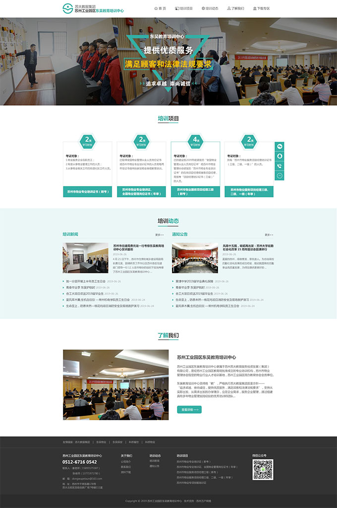 東吳教育培訓(xùn)中心堅(jiān)持姓“教”,嚴(yán)格執(zhí)行蘇大教服集團(tuán)質(zhì)量方針——“追求卓越、崇尚誠(chéng)信,提供優(yōu)質(zhì)服務(wù),滿足顧客和法律法規(guī)要求”,堅(jiān)持從實(shí)際出發(fā)、從需求出發(fā)的辦學(xué)理念,立足企業(yè)需求,服務(wù)企業(yè)管理,通過(guò)組建具有多年物業(yè)管理實(shí)踐經(jīng)驗(yàn)的優(yōu)秀培訓(xùn)師團(tuán)隊(duì),著力提高一線管理人員基礎(chǔ)管理水平和一線員工技能水平,為全行業(yè)從業(yè)人員提供優(yōu)質(zhì)服務(wù)。中心自成立以來(lái)密切與各專業(yè)協(xié)會(huì)、各物業(yè)單位協(xié)作配合,與江蘇省高校后勤、蘇州市物協(xié)等單位合作開展了一系列專業(yè)課程培訓(xùn),都取得了良好的培訓(xùn)效果。