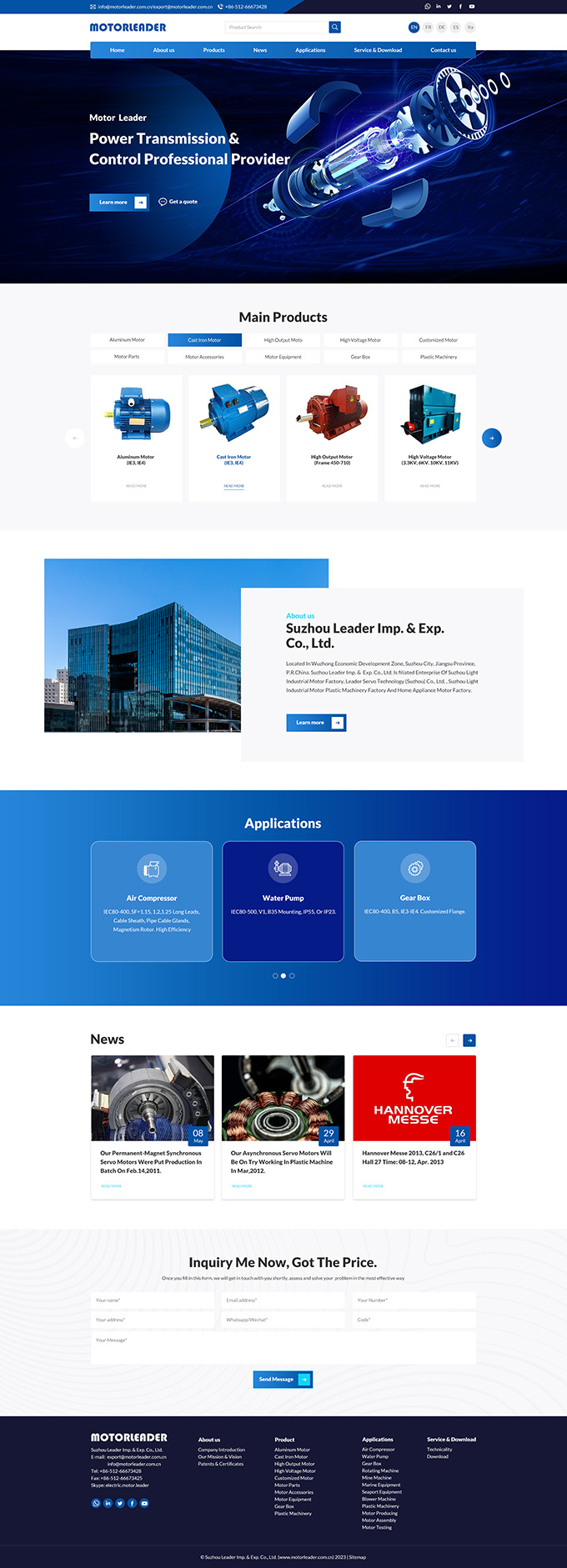 Located In No.369 Lushan Road, New District, Suzhou City, Jiangsu Province, P.R.China. Suzhou Leader Imp. & Exp. Co., Ltd. Is A Manufacturer And Exporter Of Industrial Electric Motors (IEC Standard, NEMA Standard, GOST Standard ) , IE3, IE4 And High Voltage; Direct Current Electric Motors (DC); Centrifugal Fan/Blower, Axial Fan/Blower And Permanent Magnetic Synchronous Motors