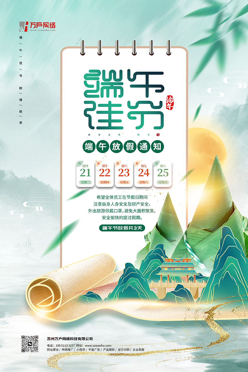 在2023年端午節(jié)到來之即,蘇州做網(wǎng)站的公司萬戶網(wǎng)絡(luò)衷心祝福各位及家人端午節(jié)快樂、身體健康!根據(jù)國(guó)務(wù)院假日安排通知規(guī)定,結(jié)合公司實(shí)際情況,