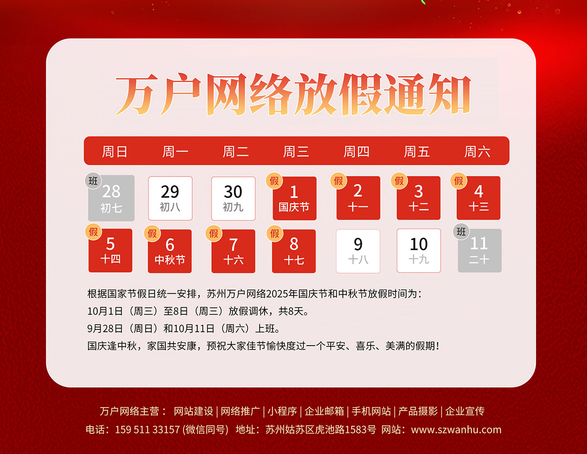 根據(jù)國家節(jié)假日統(tǒng)一安排,蘇州萬戶網絡2025年國慶節(jié)和中秋節(jié)放假時間為: